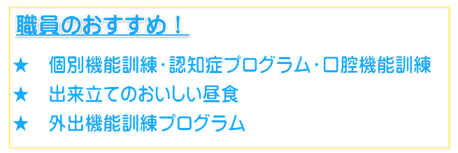 運動ゲーム、卓上ゲーム、作品作り(季節の作り物、バザー品作成など)、短歌&俳句、歌声喫茶(職員によるキーボード演奏や大正琴演奏、懐かしい映像を見ながら歌を楽しみます)、園芸活動(園庭脇にある畑で野菜を育てています)、クッキングクラブ(毎日お手伝いしていただいています)他