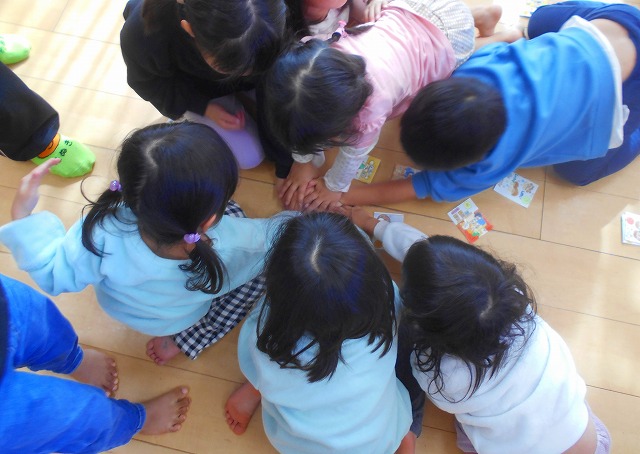 手札を読む間、子ども達は「おてつき」しないように手を頭にのせて、絵札を探します!その顔は真剣!!