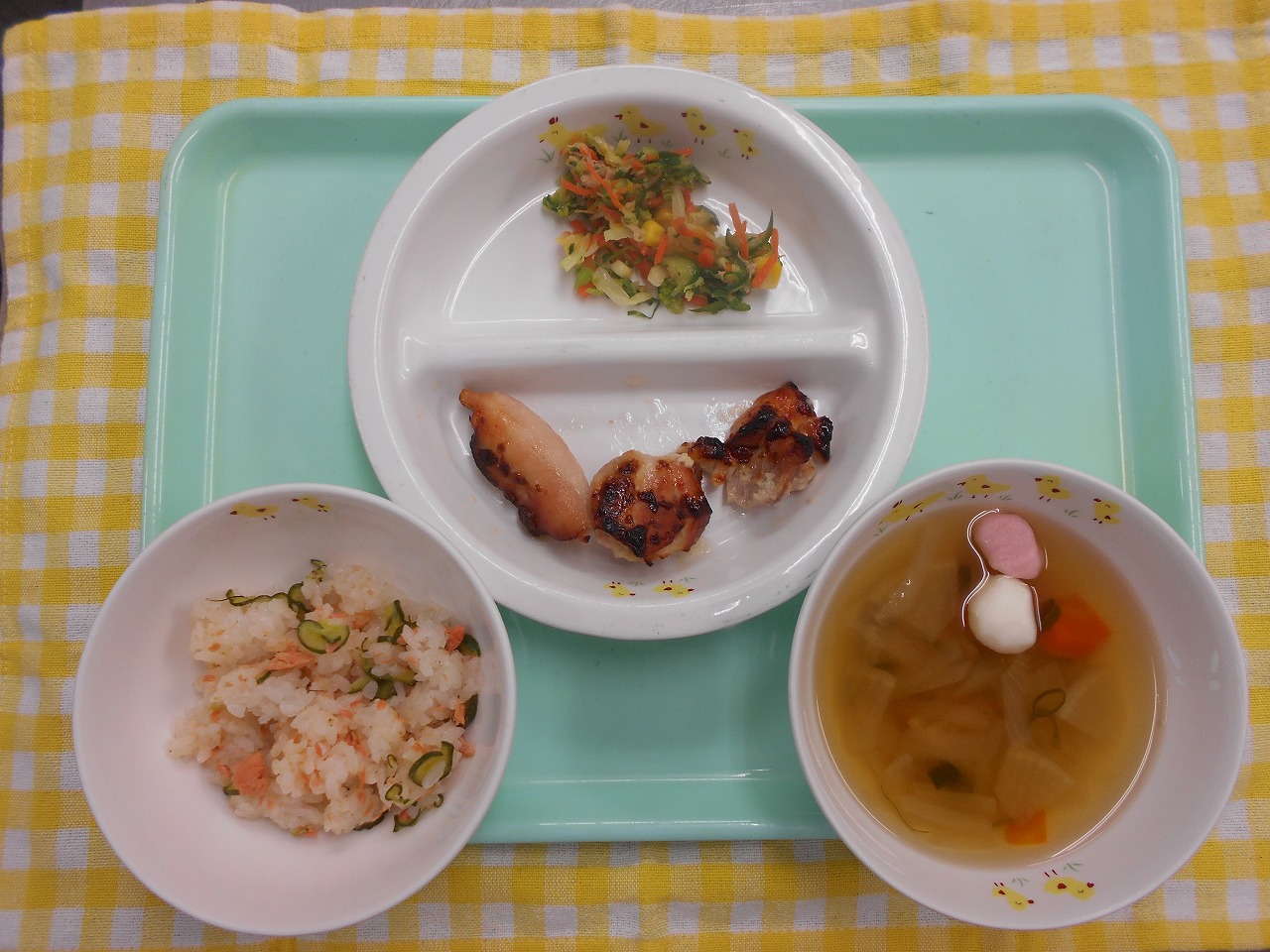 昼食には、鮭フレーク、きゅうりを混ぜた散らし寿司、おやつはいちごをトッピングしたババロアです。このババロアも、さくらぐみからリクエストをもらったメニューです!