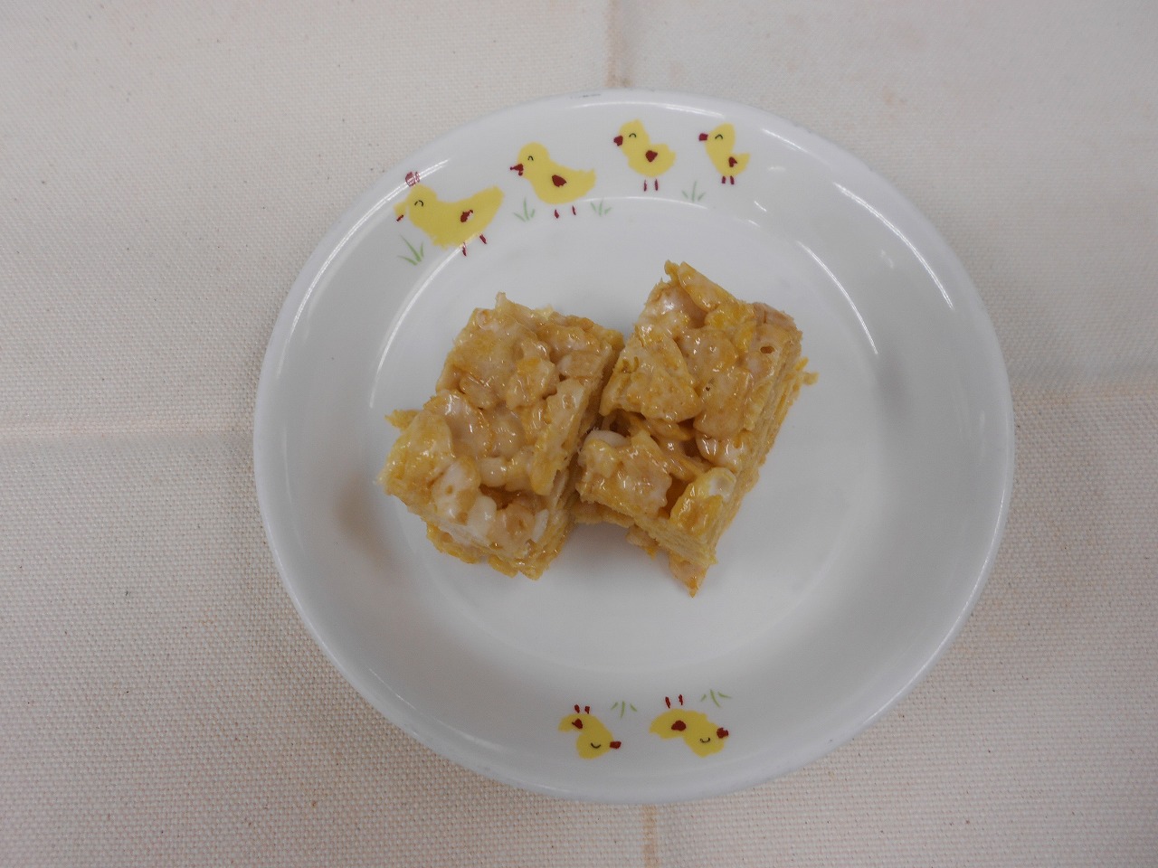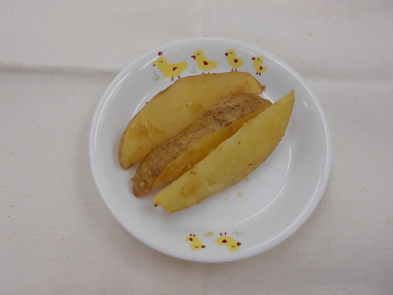 洗ったじゃが芋を、給食室で小さく切って、焼いて、ごま味噌のたれとからませたら「ポテト田楽」の出来上がり!
