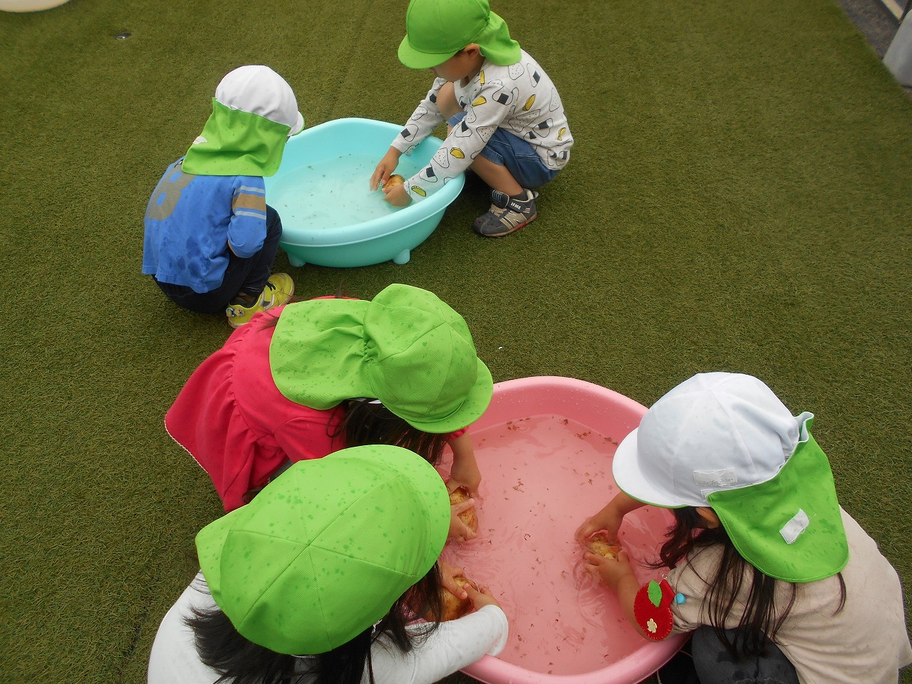あじさいぐみさんに、おやつに使うじゃが芋の泥を落として、きれいに洗うお手伝いをお願いしました!
