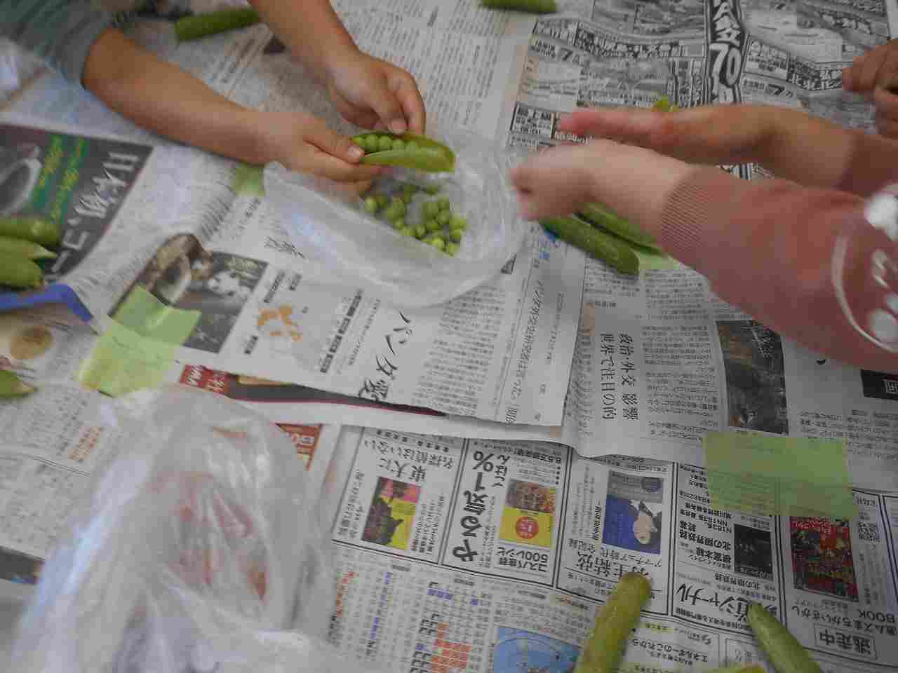 今日のおやつに入っているグリンピースは、ひまわりぐみの子ども達が、さやむきのお手伝いをしてくれました。