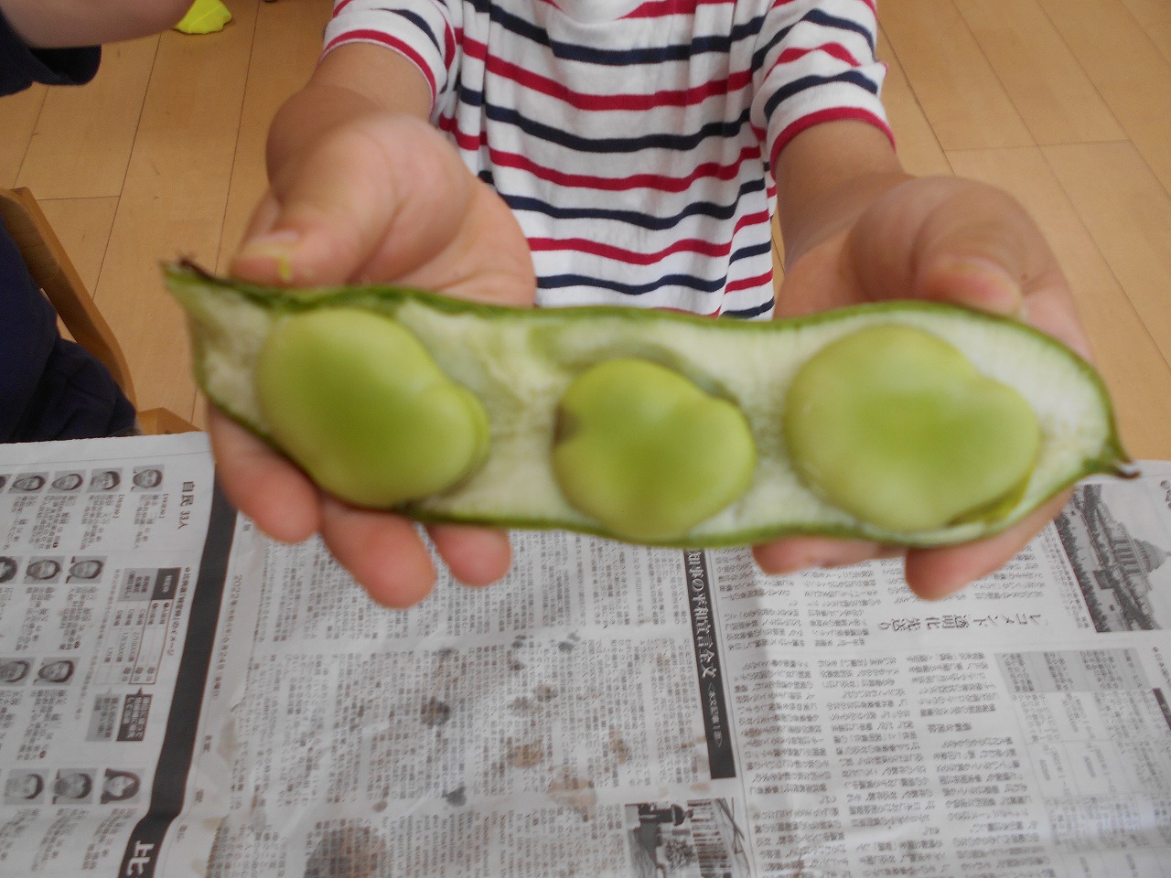 明日のおやつに使う空豆のさやむきを、ひわまりぐみの子ども達にお手伝いお願いしました!