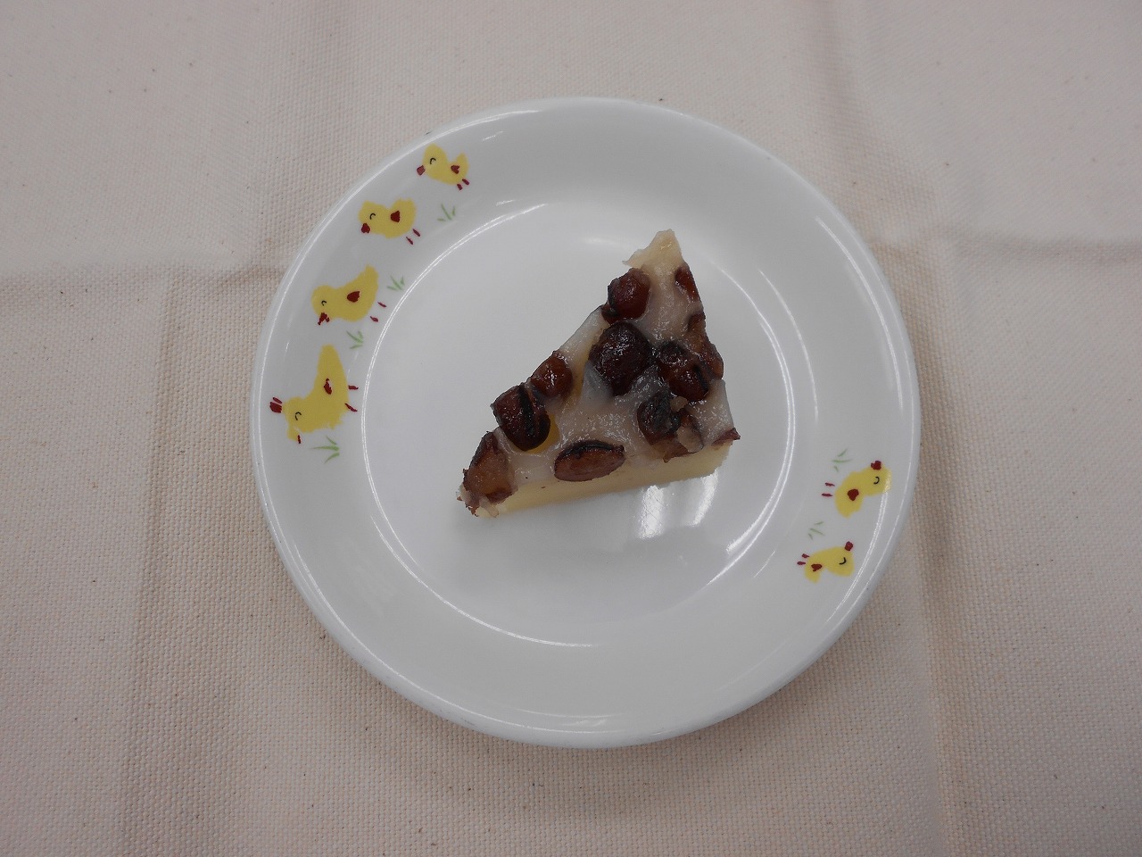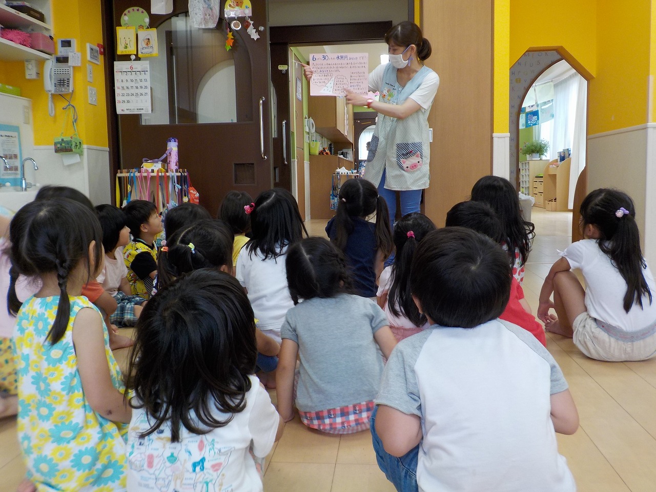 今日は、1年の折り返し「夏越しの祓(なごしのはらえ)です。水無月を食べて残りの半年も元気に過ごせるように、これからやってくる暑い夏にも負けないように、お願いしながら食べましょう!と、保育室を回ってお話しました。
