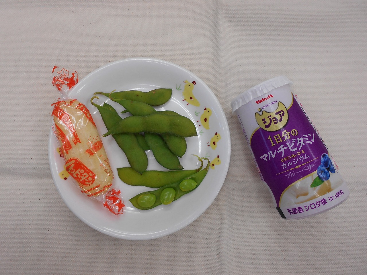 茹で枝豆、せんべい、ジョア