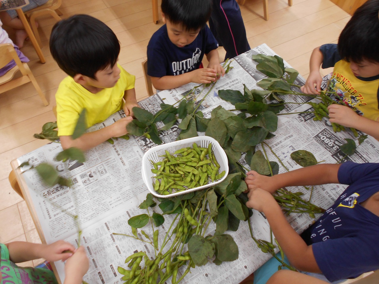 今日は、あじさいぐみさんが、おやつの枝豆を枝からもぎ取るお手伝いをしてくれました!「固くて取れないよー」という声も聞かれましたが、最後まで諦めずに、頑張ってお手伝いできました!