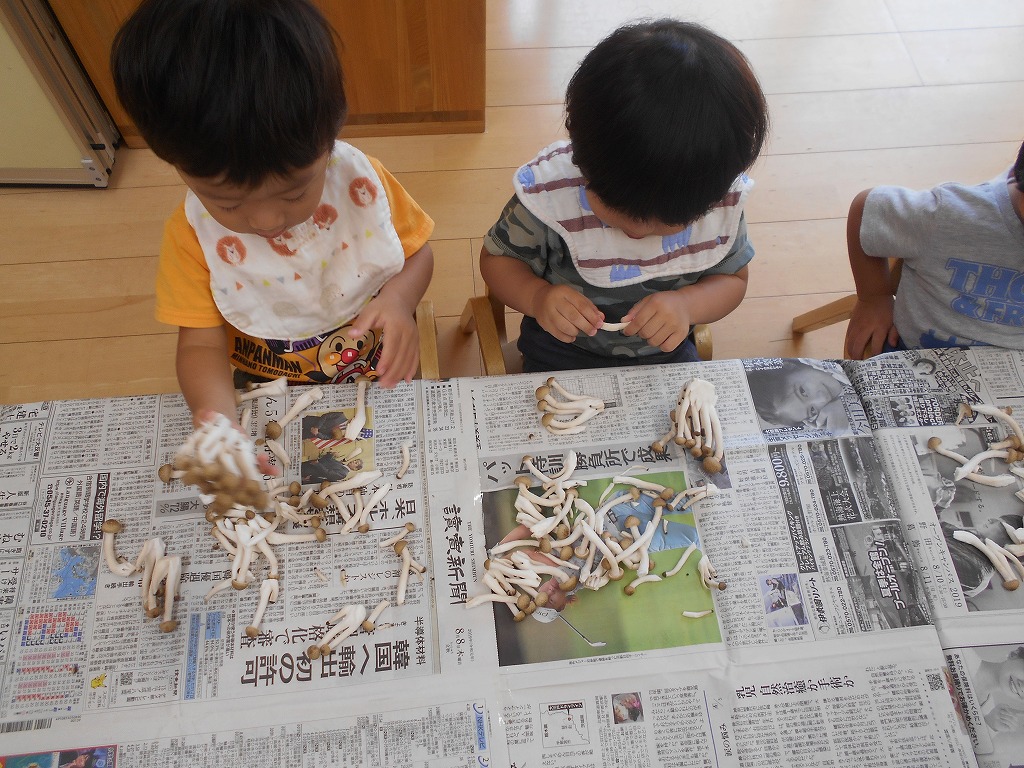 今日は、すみれぐみさんにしめじのふさ取りのお手伝いをお願いしました!初めての給食のお手伝いでした!が、目の前に置かれたしめじを見て、固まる子が多かったです。
