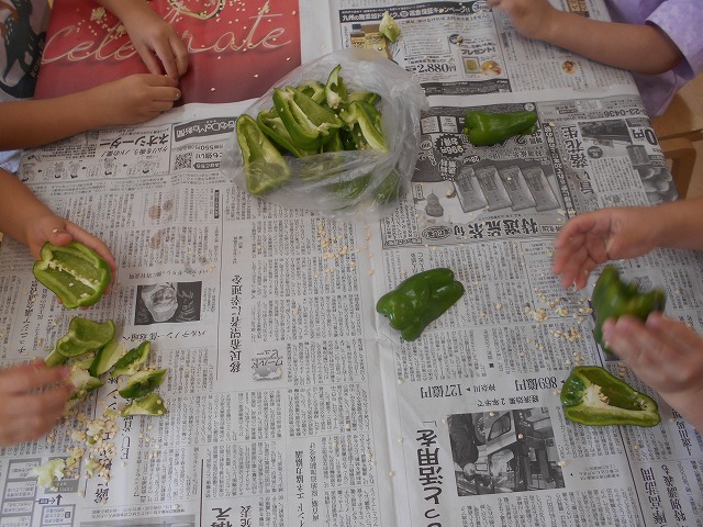 今日は、あじさいぐみの子ども達が、明日の給食に使うピーマンの種を取るお手伝いをしました!
