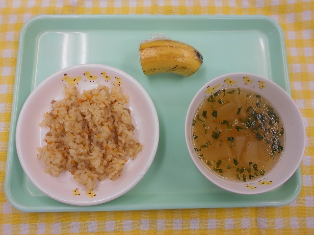1日早いですが、今日の給食には、さつまいもを栗に見立てた栗風ごはん、味噌汁にはなすを入れました。