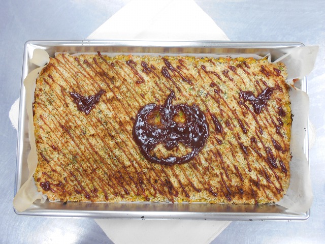 昼食にもおやつにも、南瓜を使い、ハロウィンを意識するメニューになりました!スコップコロッケは、コロッケの種を鉄板に敷き詰めて焼き、スコップですくうように盛り付けるイメージです!表面にはケチャップソースで南瓜をお絵書き♪見ても楽しいコロッケになりました。
