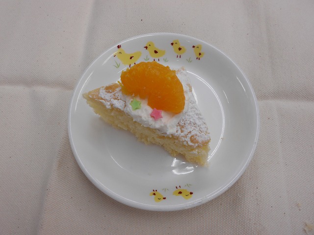 おやつのケーキは、三角にカットして、生クリーム、みかんと、スターシュガーをトッピング!いつものケーキより、豪華にできました!