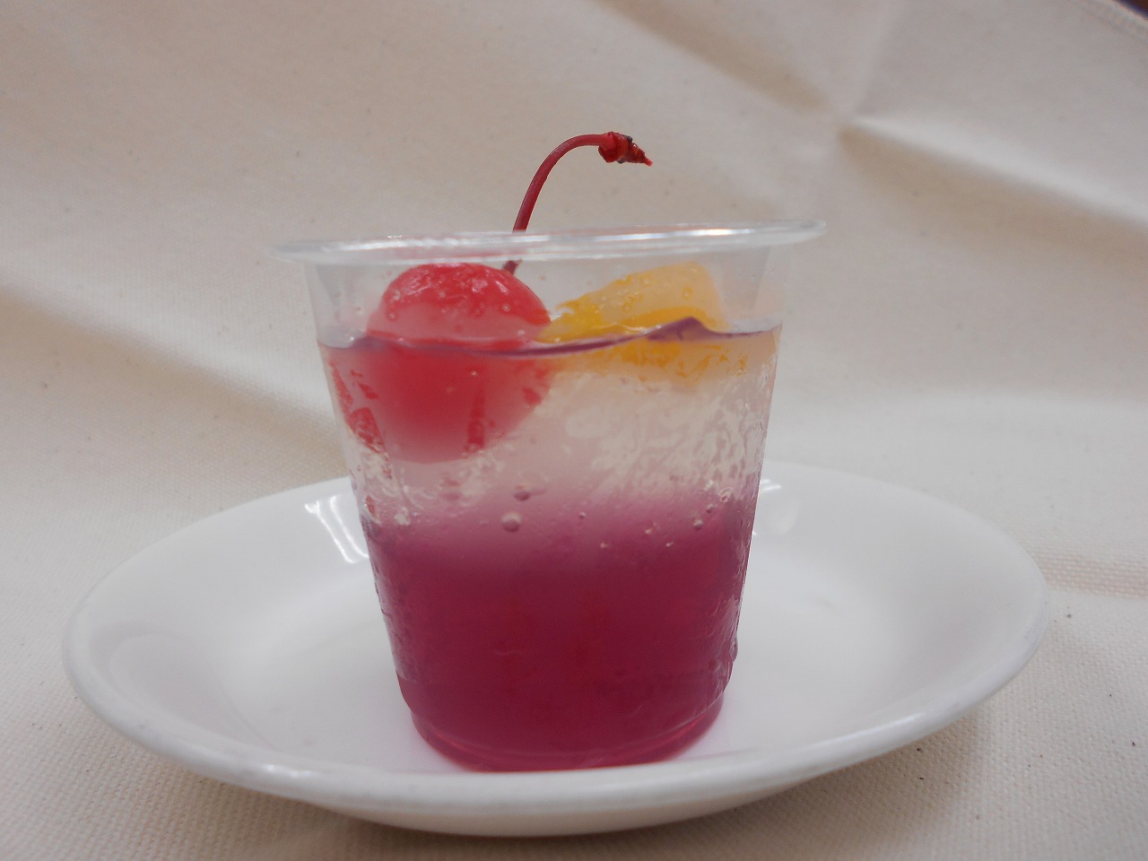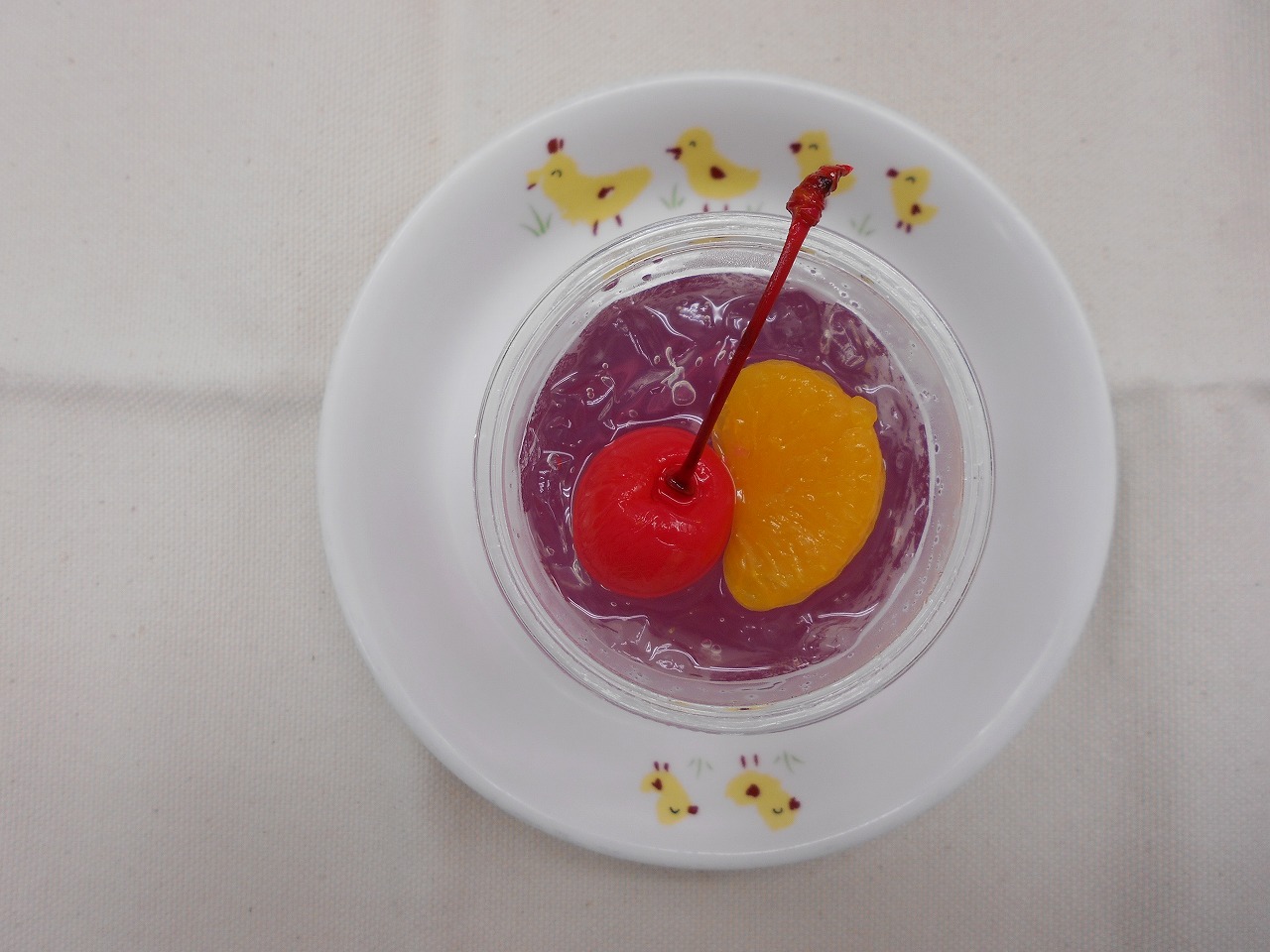 おやつは2層のゼリーにフルーツをトッピングしました。