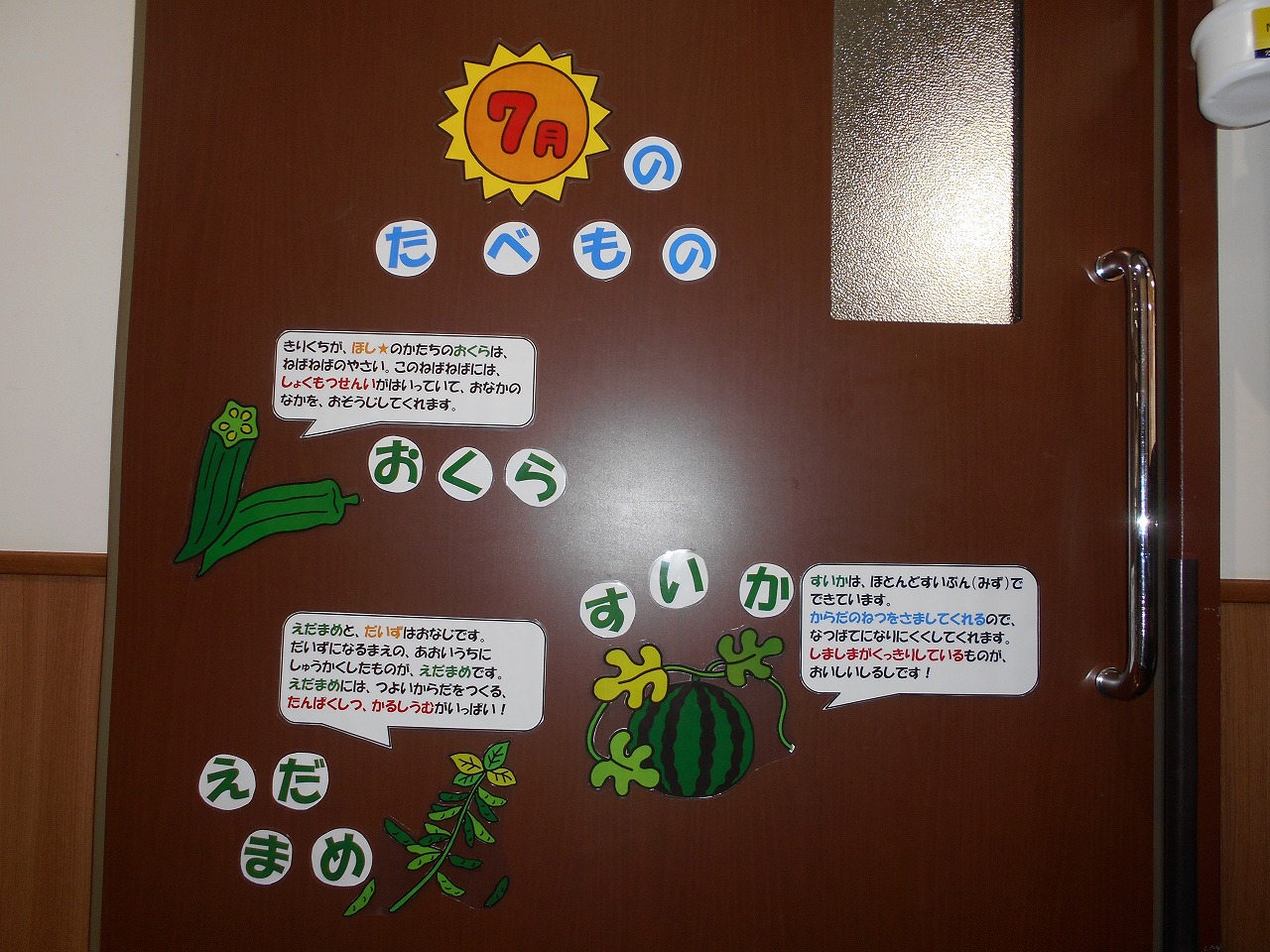 給食室の入り口に、旬の食べ物を掲示したので、先生と一緒に見に来てね!