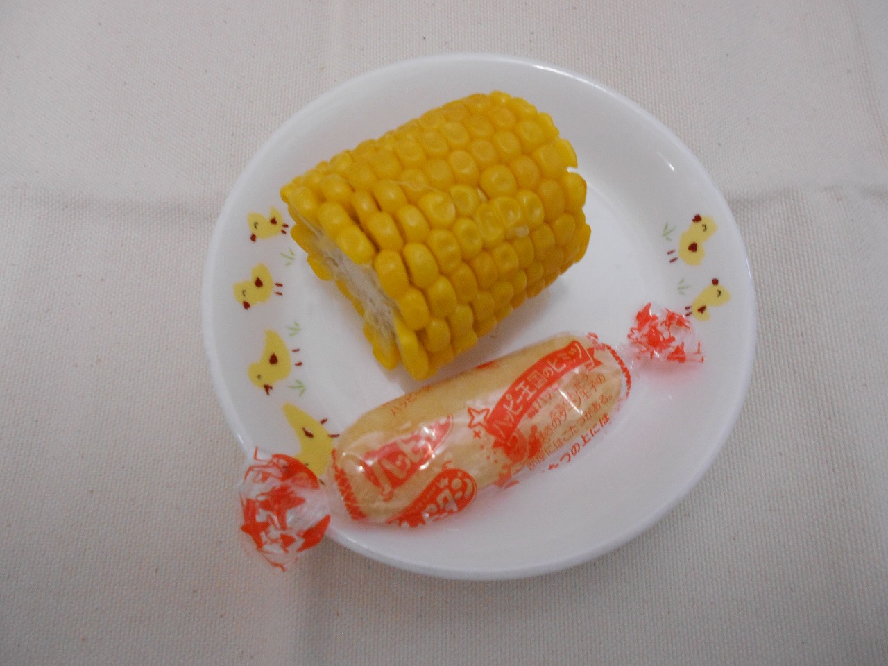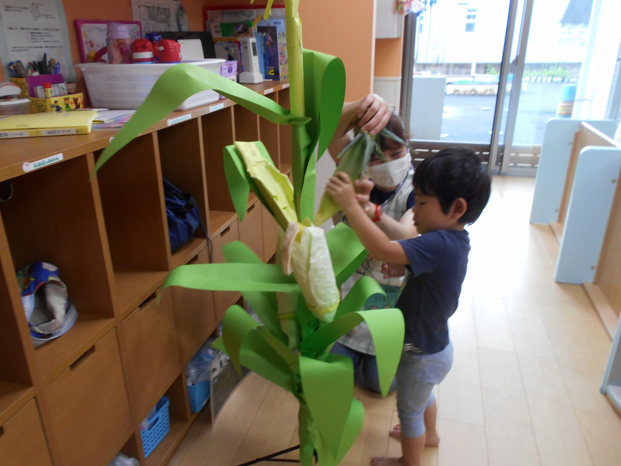 今日のおやつのとうもろこしの皮むきは、ちゅうりっぷぐみの子ども達にお手伝いをお願いしました。