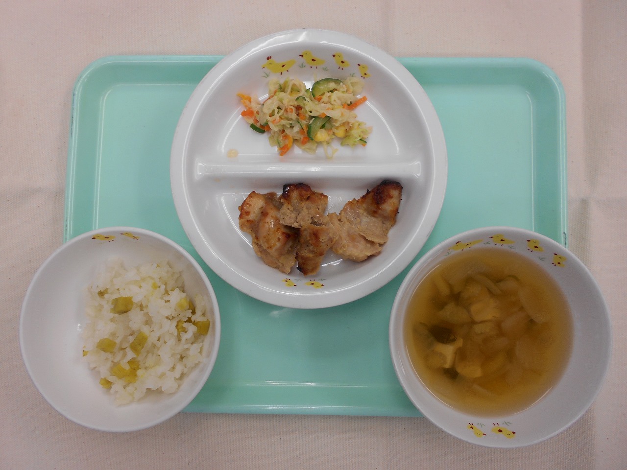 今日は、栗(さつま芋に変更しました)の入ったご飯と、なすの入ったすまし汁を食べて、こども園でもお祝いです!