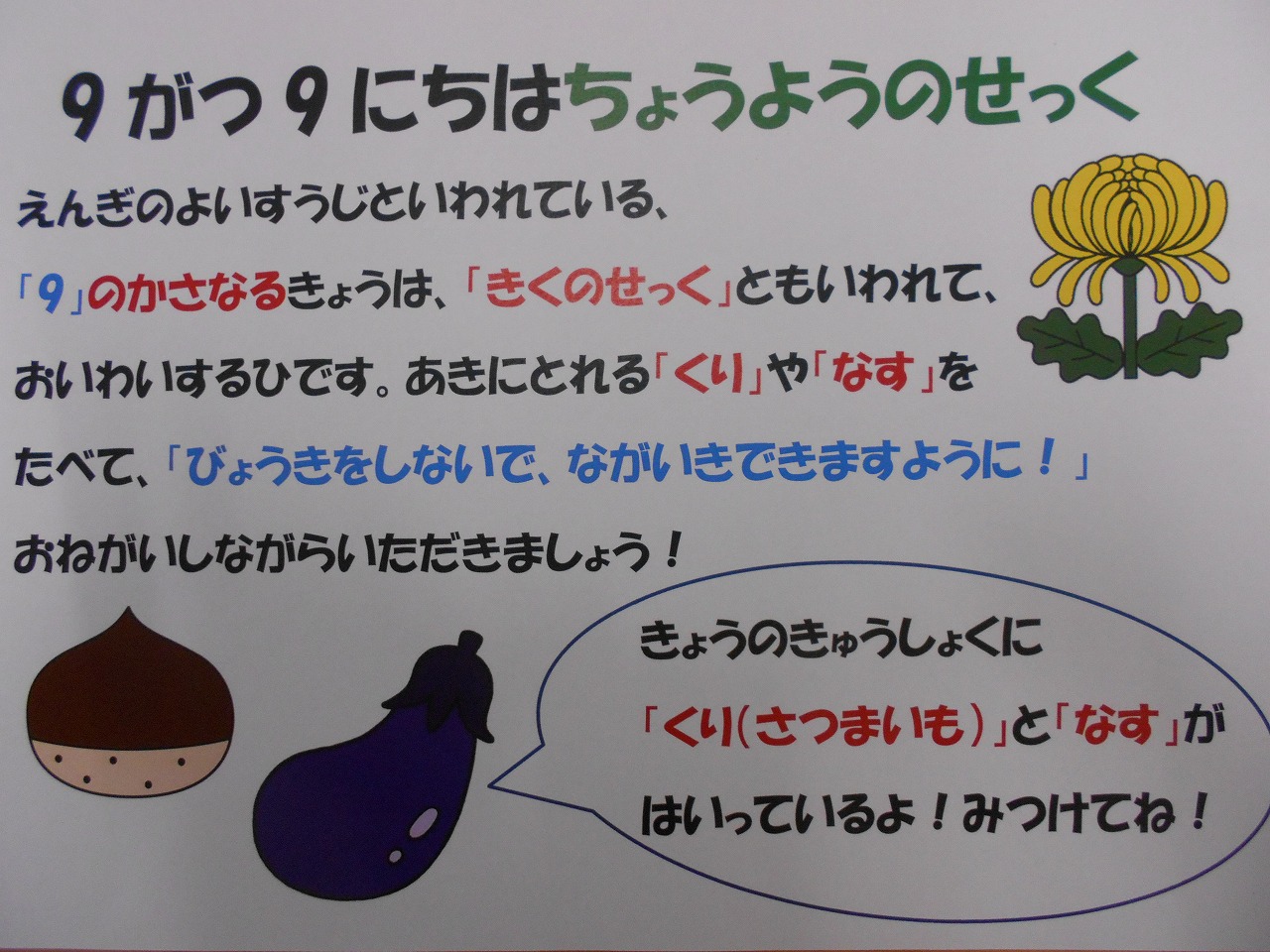 その中でも一番大きい「9」が重なる今日は、菊の香りを移したお酒や、栗やなすなどの秋に収穫される食べ物を食べて、「元気に長生きできますように!」とお願いしました。