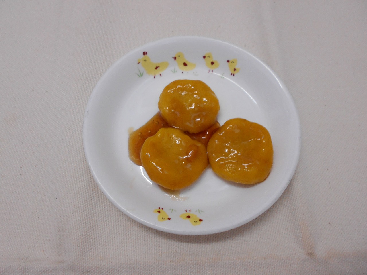 お月見だんごは、歯切れのよいように、南瓜、豆腐を練り込み、平たく成型して作りました。