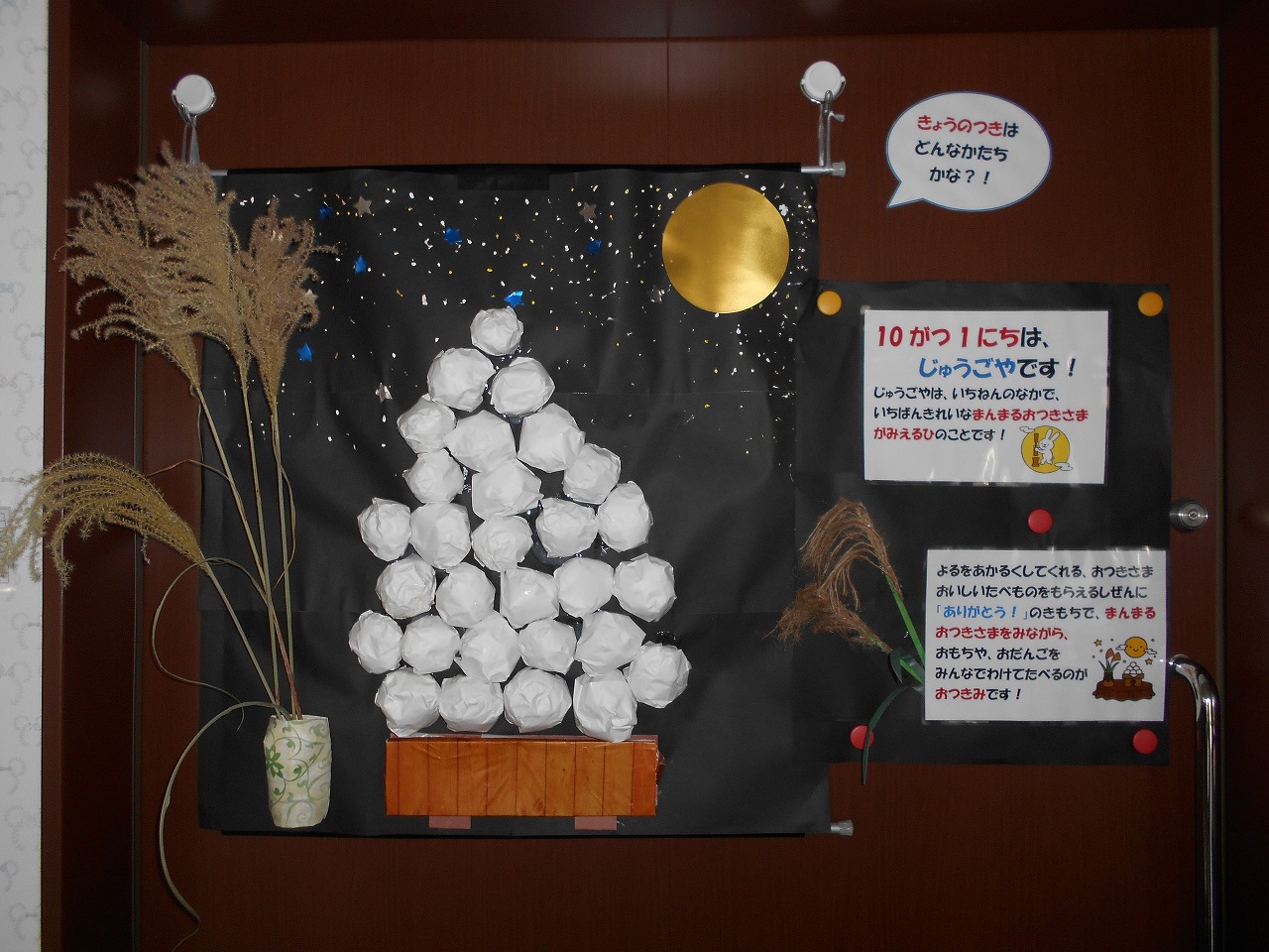 そして、こども園の入り口には、まんまるのお月見だんごを飾りました。