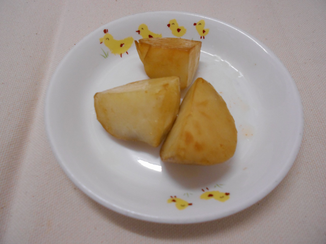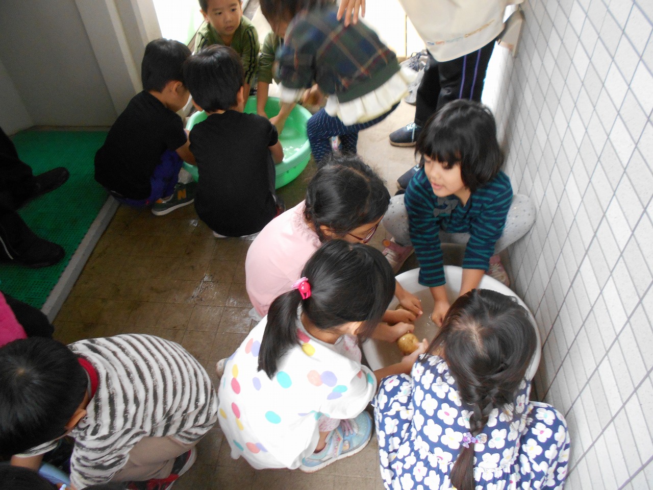 本当は屋上で行う予定でしたが、あいにくのお天気だったので、ベランダで行いました。じゃが芋のお話を聞いてから、ベランダに移動!寒い中でしたが嫌がる子は一人もいませんでした。「どう?キレイになった?」と、ピカピカのじゃが芋を見せてくれました!