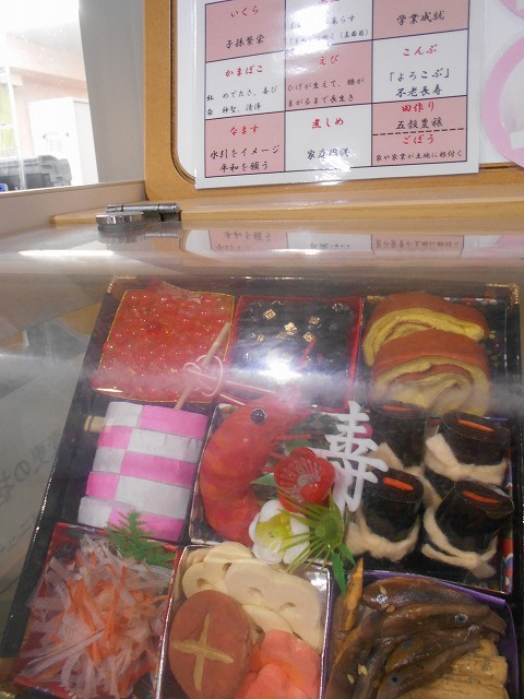 サンプルケースには、調理員さんが「おせち料理、それぞれが持つ意味を知ってもらうお手伝いができれば!」と、心を込めて作ってくれた立体模型を掲示しています。お時間のある時に見てください!!