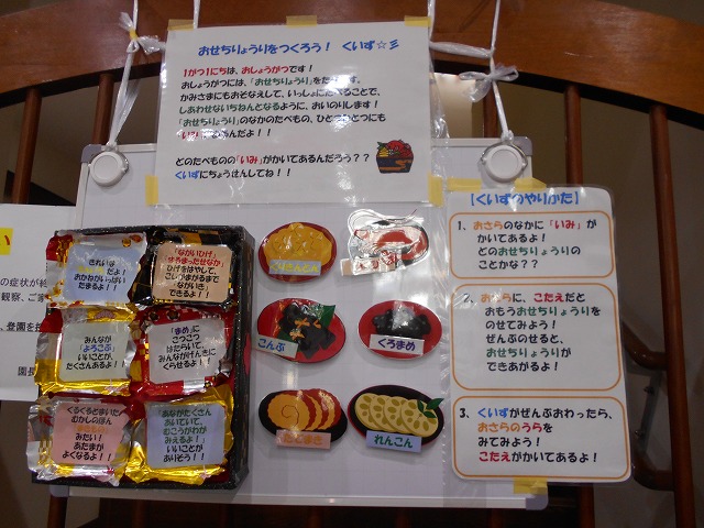 年末から、玄関ホール前の階段扉に「おせちりょうりをつくろうくいず」を掲示しています。
