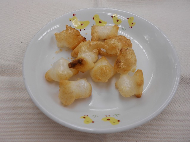 そして、今日はちょっと早めの鏡開きメニューで、おやつにおかきを作りました。毎年1月11日は鏡開きです。