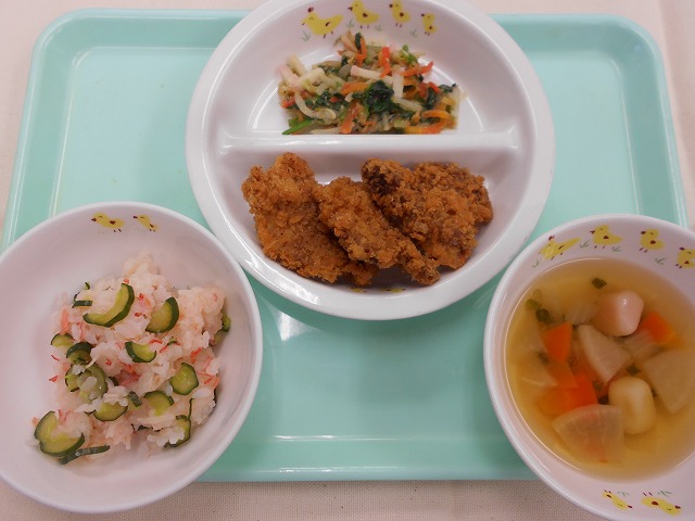 昼食には、鮭フレーク、きゅうりを混ぜた散らし寿司に、みんなが大好きなひとくちカツです!給食室は大忙しでしたが、子ども達は「おいしい!」と食べてくれたようで、嬉しいです!
