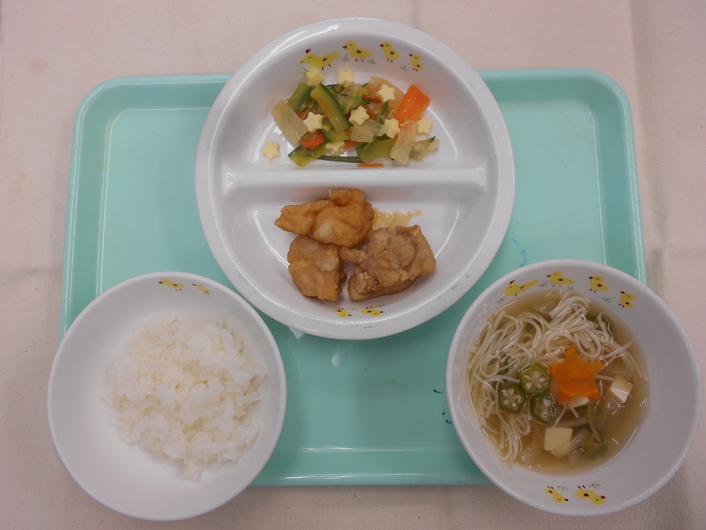 今日は七夕の節句です。昼食の短冊サラダには星形のチーズ、にゅうめんには星の形に型抜きしたにんじんを入れ、おやつにも星型ゼリーをトッピング!