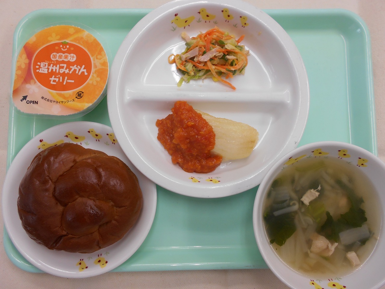 主菜の「魚のカルカッタ風」は、焼いたお魚の上に、トマトベースにカレーの風味を足したソースをかけたものです。ソースの中には、ひまわりぐみ、さくらぐみで収穫したトマト、ピーマンを入れました!