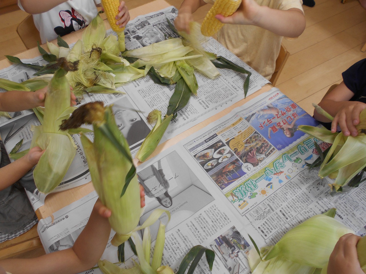 今日のおやつのとうもろこしは、さくらぐみのみんなが皮むきのお手伝いをしてくれました!
