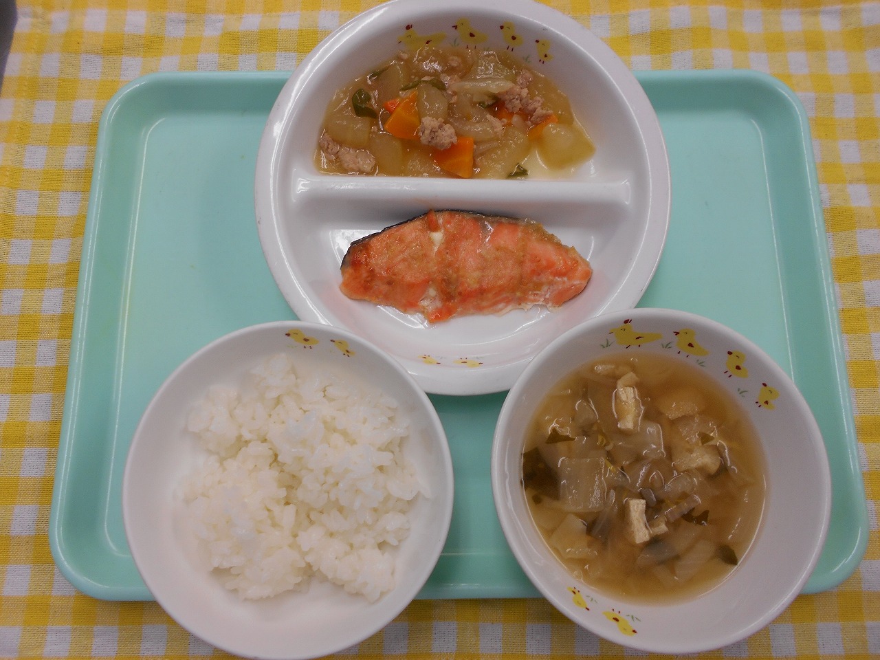 味噌汁(キャベツ、油揚げ、もやし、わかめ)