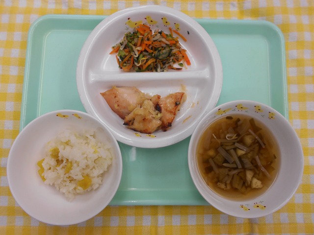 1日早いですが、今日の給食には、さつまいもを栗に見立てた栗風ごはん、味噌汁にはなすを入れました。