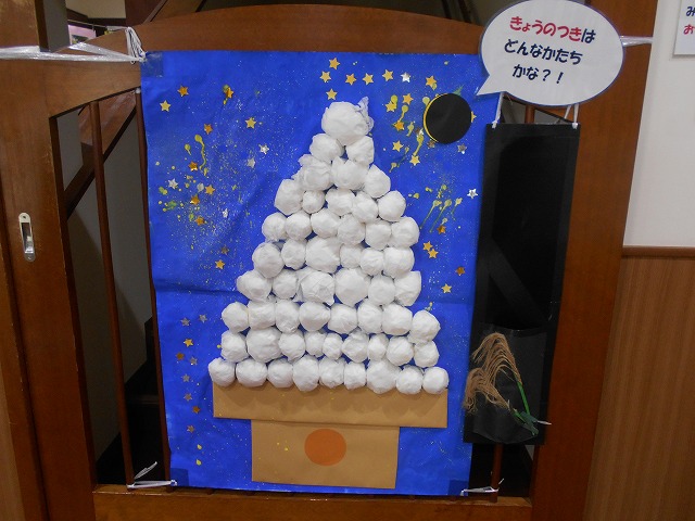 そして、今年も十五夜に向けた食育が始まりました。29日の満月までの期間、月の満ち欠けを掲示します。大きなお団子は、さくらぐみの子ども達が作ってくれました!