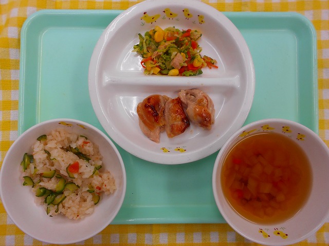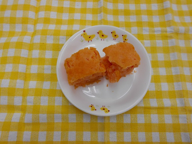 昼食には、鮭フレーク、きゅうりを混ぜた散らし寿司、おやつは、桃の節句にちなみ、桃の缶詰を入れたケーキを作りました!