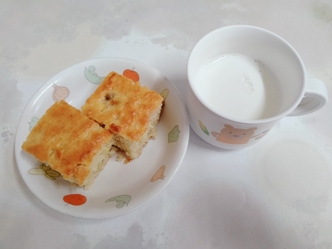 おやつはバナナケーキと牛乳です。