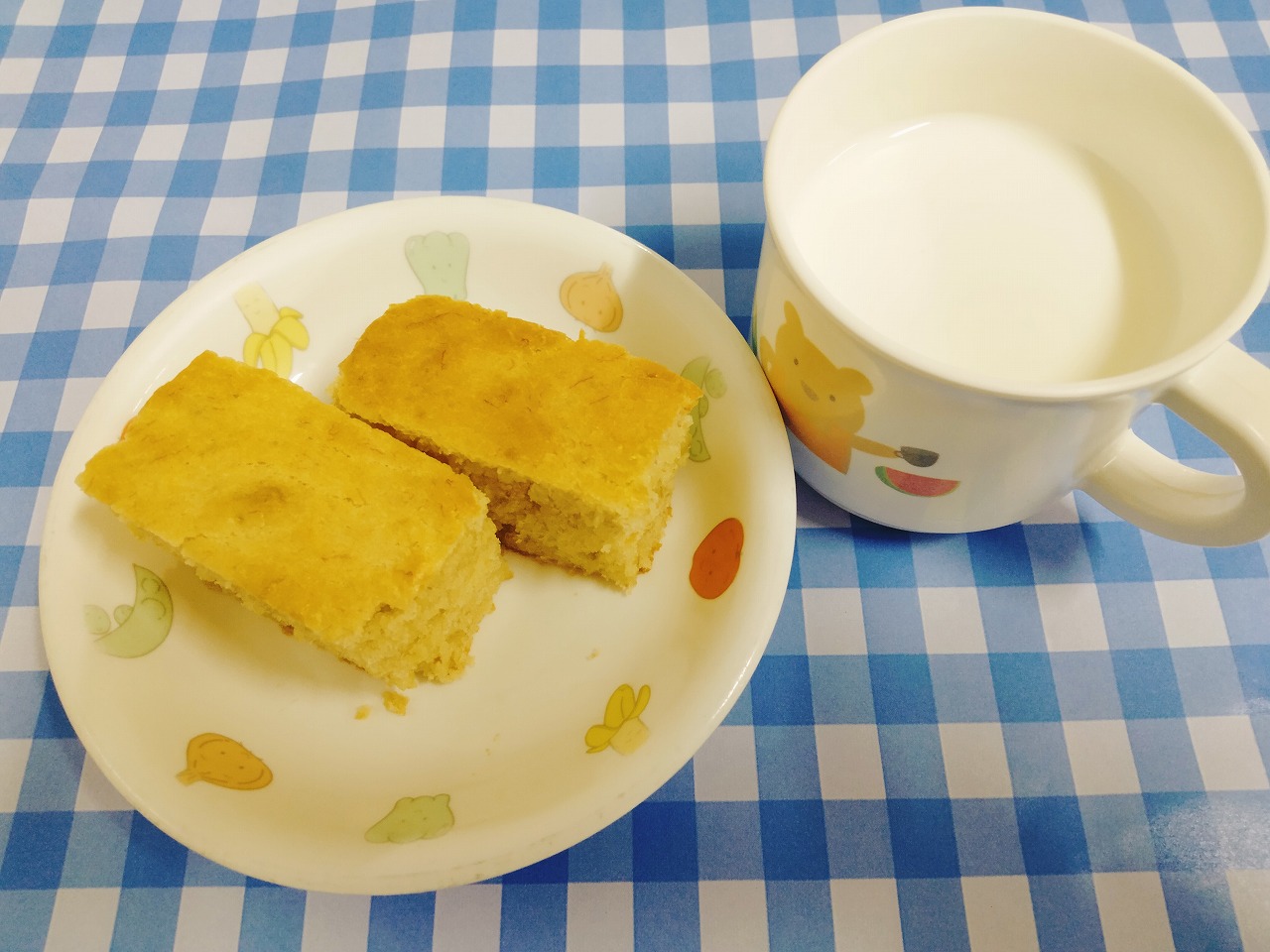 おやつはバナナケーキと牛乳です。