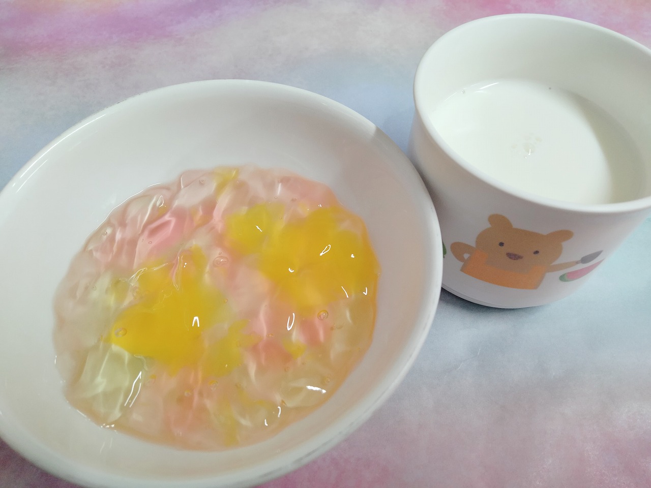 おやつはカラフルゼリーと牛乳です。