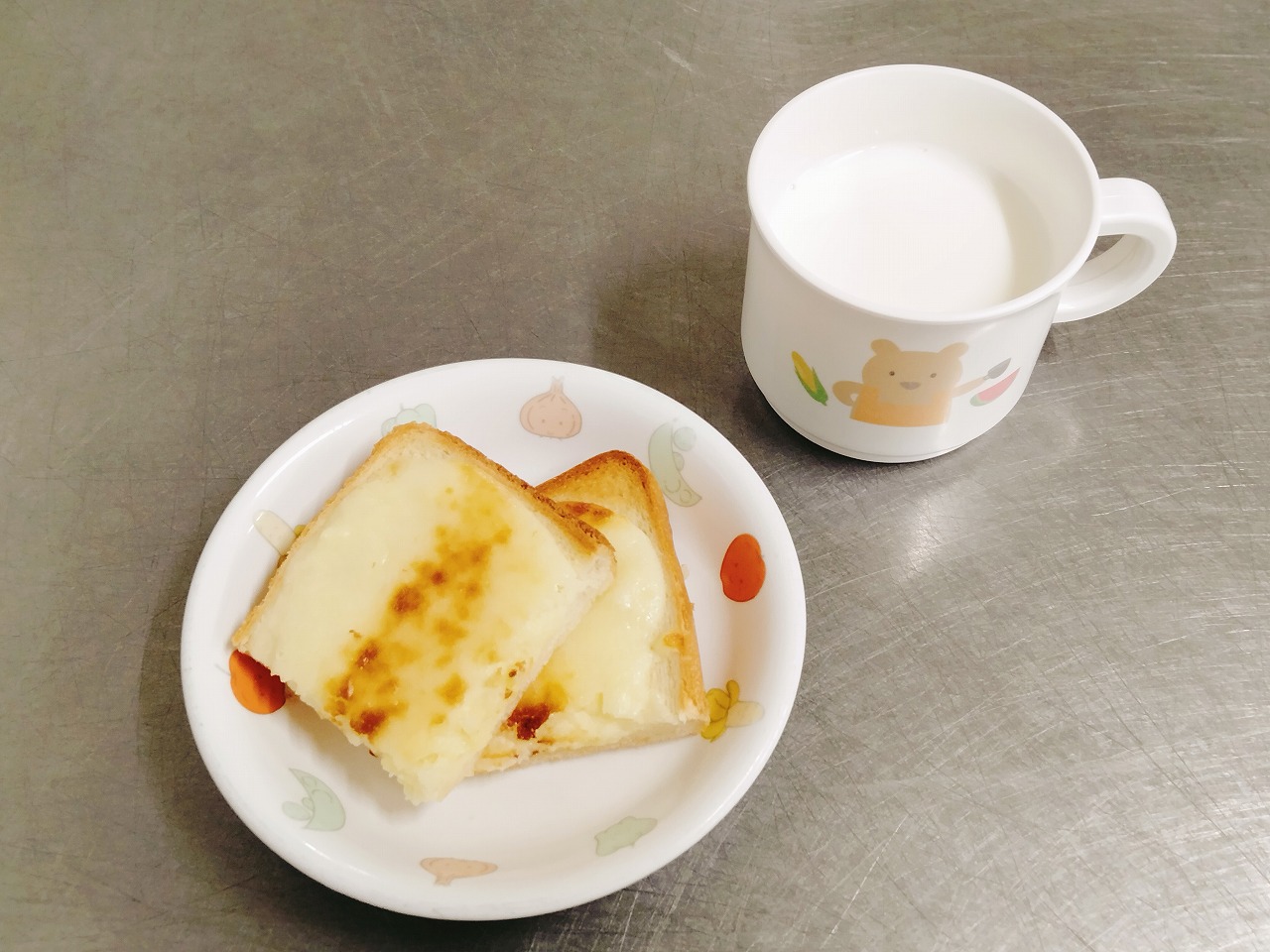 おやつはチーズケーキトーストと牛乳です。