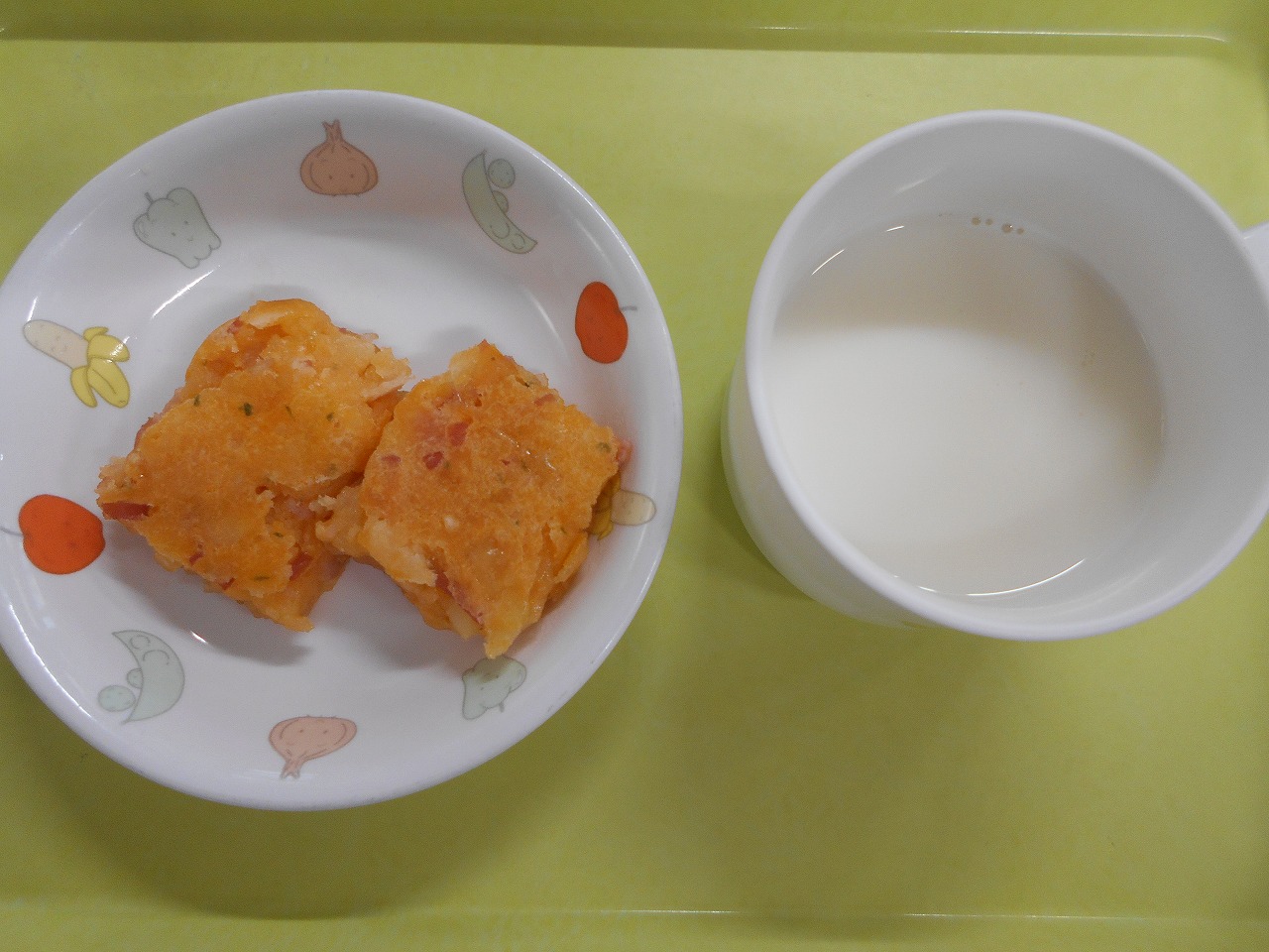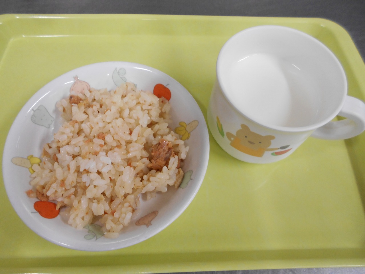 おやつは鮭と油揚げの混ぜごはんと牛乳です。