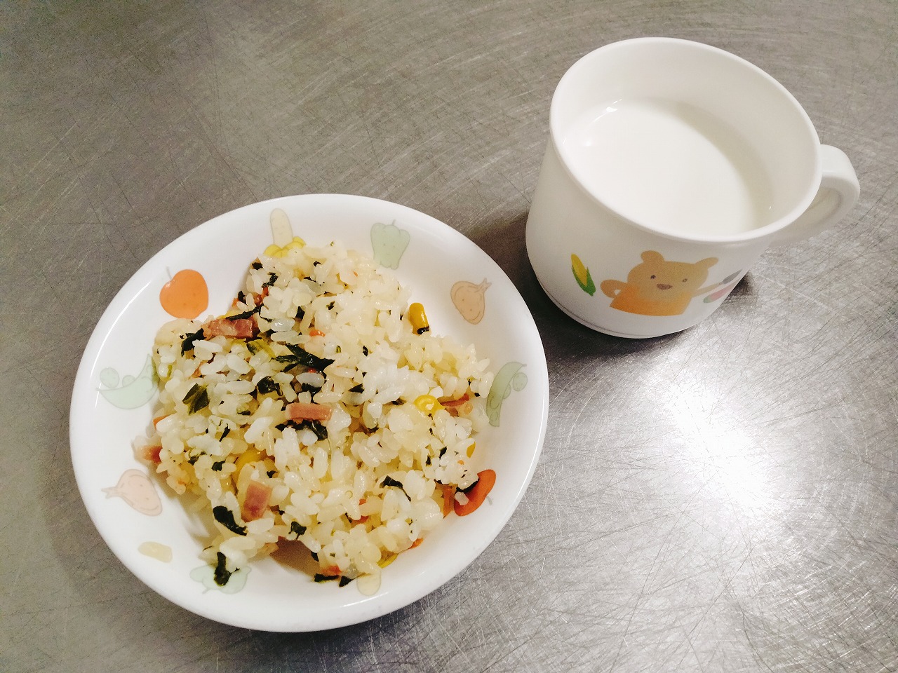 おやつはベーコンのバター醬油ごはんと牛乳です。