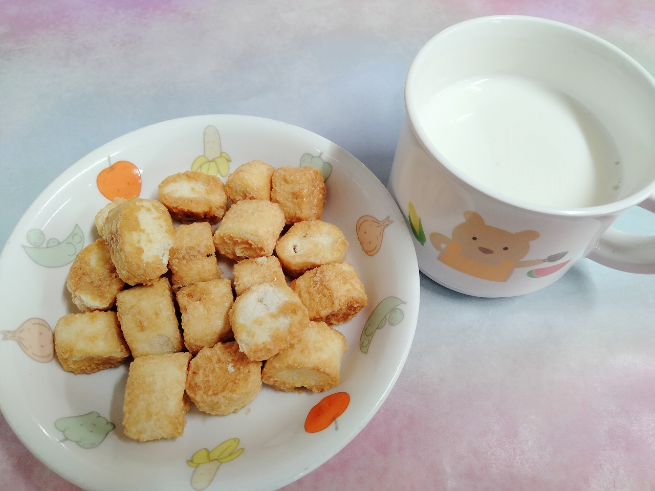 おやつはきなこ揚げパンと牛乳です。