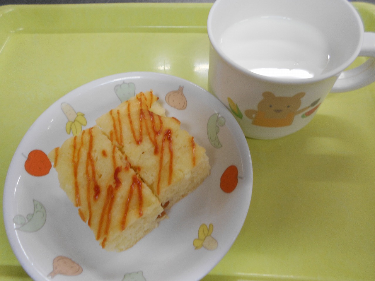 おやつはアメリカンドッグ風ケーキと牛乳です。