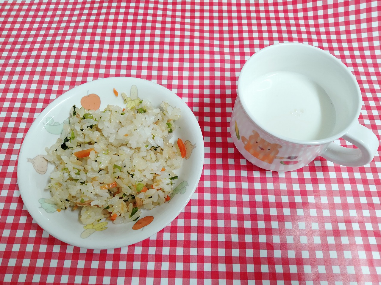 おやつは菜の花ごはんと牛乳です。