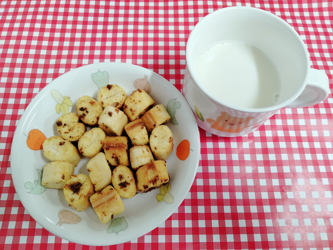 おやつはカレー麩ラスクと飲むヨーグルトです。