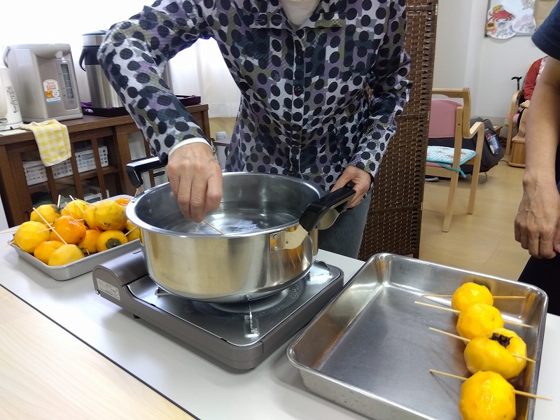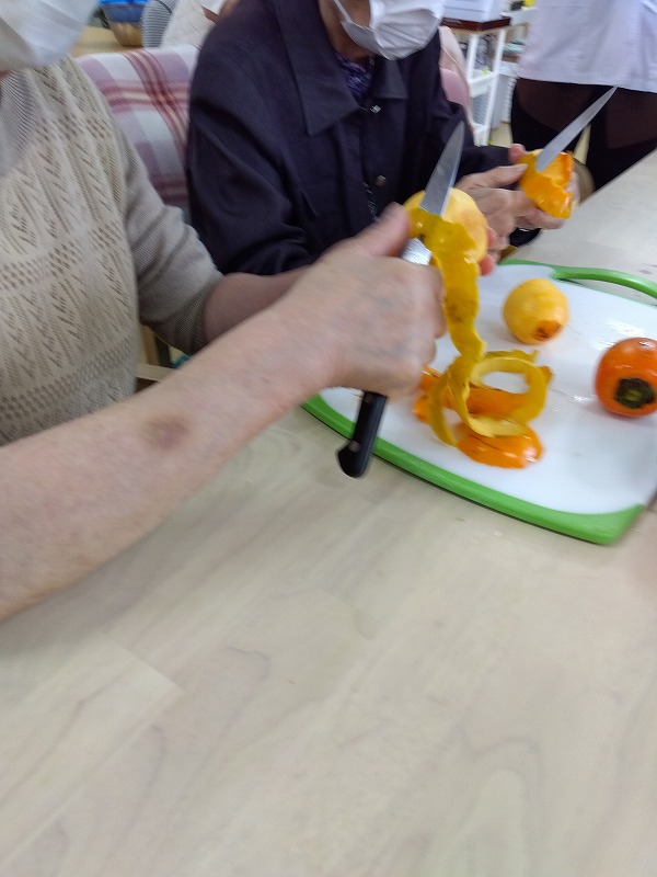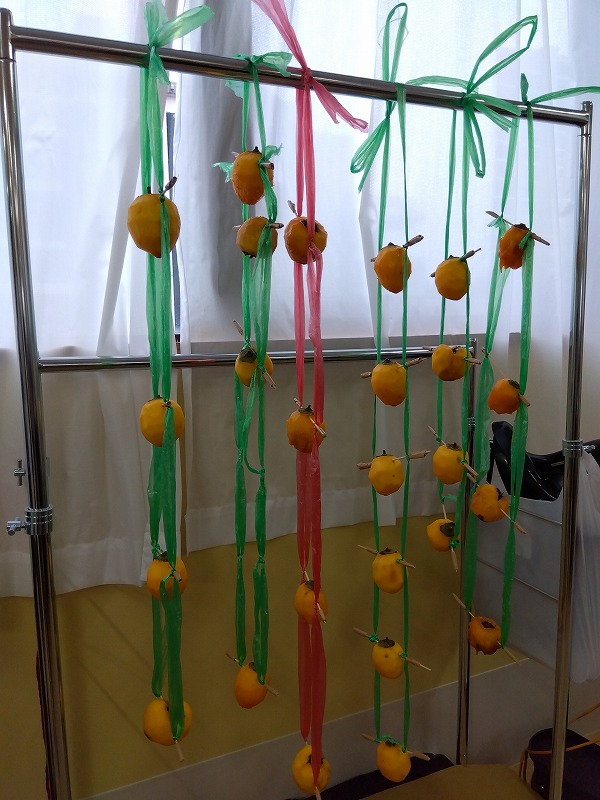 リハビリデイ古淵のご利用者かた渋柿をいただいたので、古淵デイはじめての「干し柿作り」もやりました!
